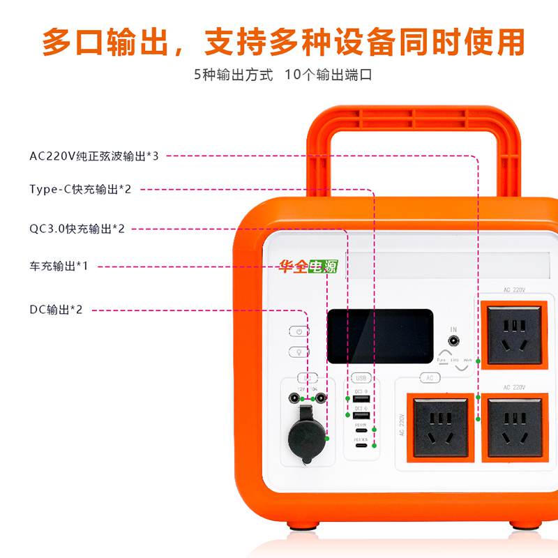 HQDY-1500-B搭配了5種共10個端口,包括AC220V純正弦波輸出*3、DC輸出*2、QC3.0快充輸出*2、車充輸出*1、Type-C快充輸出*2,支持多個設備同時使用電源。