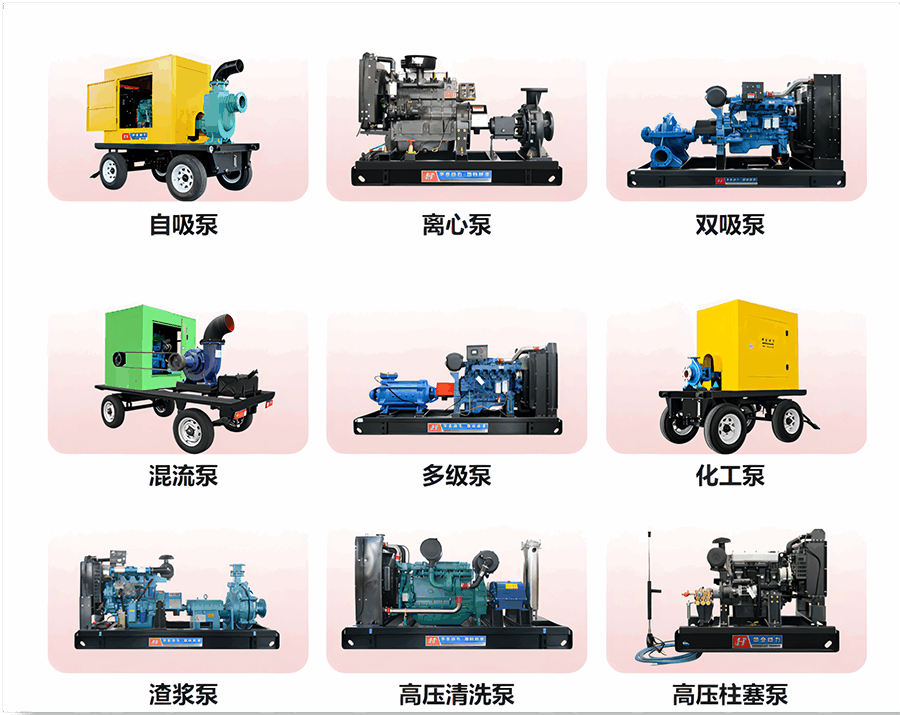 根據(jù)原理、結(jié)構(gòu)的不同,華全電力水泵機(jī)組可以分為自吸泵、離心泵、雙吸泵、混流泵、多級(jí)泵、化工泵、渣漿泵、高壓清洗泵、高壓柱塞泵等。