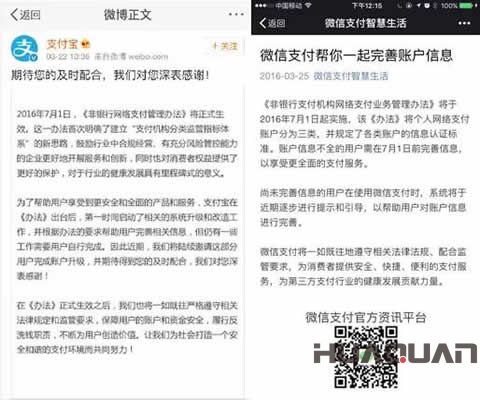 受到央行新規(guī)的約束,支付寶、微信支付等網(wǎng)絡(luò)支付平臺(tái)為了保證用戶在7月1日后依然能順利使用現(xiàn)有支付服務(wù),因此紛紛開始行動(dòng)。